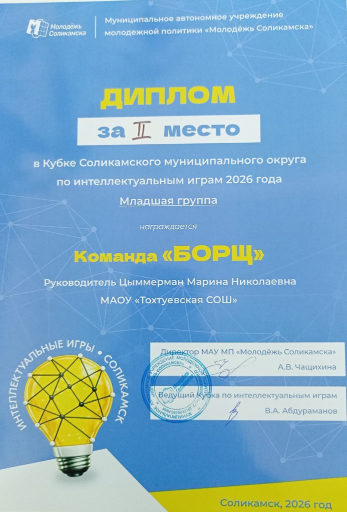 ПОЗДРАВЛЯЕМ![]() КОМАНДУ «БОРЩ» — ПРИЗЁРА МУНИЦИПАЛЬНОГО ТУРНИРА СОЛИКАМСКОГО МУНИЦИПАЛЬНОГО ОКРУГА ПО ИНТЕЛЛЕКТУАЛЬНЫМ ИГРАМ 2026 ![]() ![]() Гордимся вами, ребята! Состав команды: Артемий Березин, Иван Чуклинов, Юрий Денисенко, Лев Шилоносов, Семён Котиков.