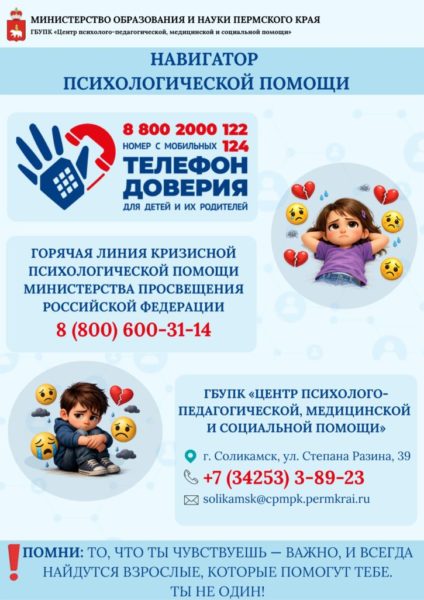 В Пермском крае действует служба Детского телефона доверия ☎ 88002000122 или 124 (короткий для мобильных телефонов).